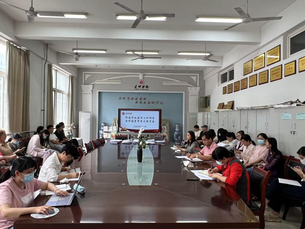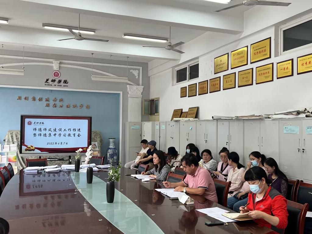 为深入学习贯彻习近平新时代中国特色社会主义思想和党的二十大精神,落实《sunbet申搏官方网站“以德育德 两代师表共同塑造”行动方案》,不断提高教师道德修养,弘扬新风正气,树立教师良好形象,提升教育教学质量。6月7日下午,美术学院在会议室召开了师德师风建设专题教育活动。全体教师参加会议,会议由美术学院党委副书记(主持工作)文竹主持。