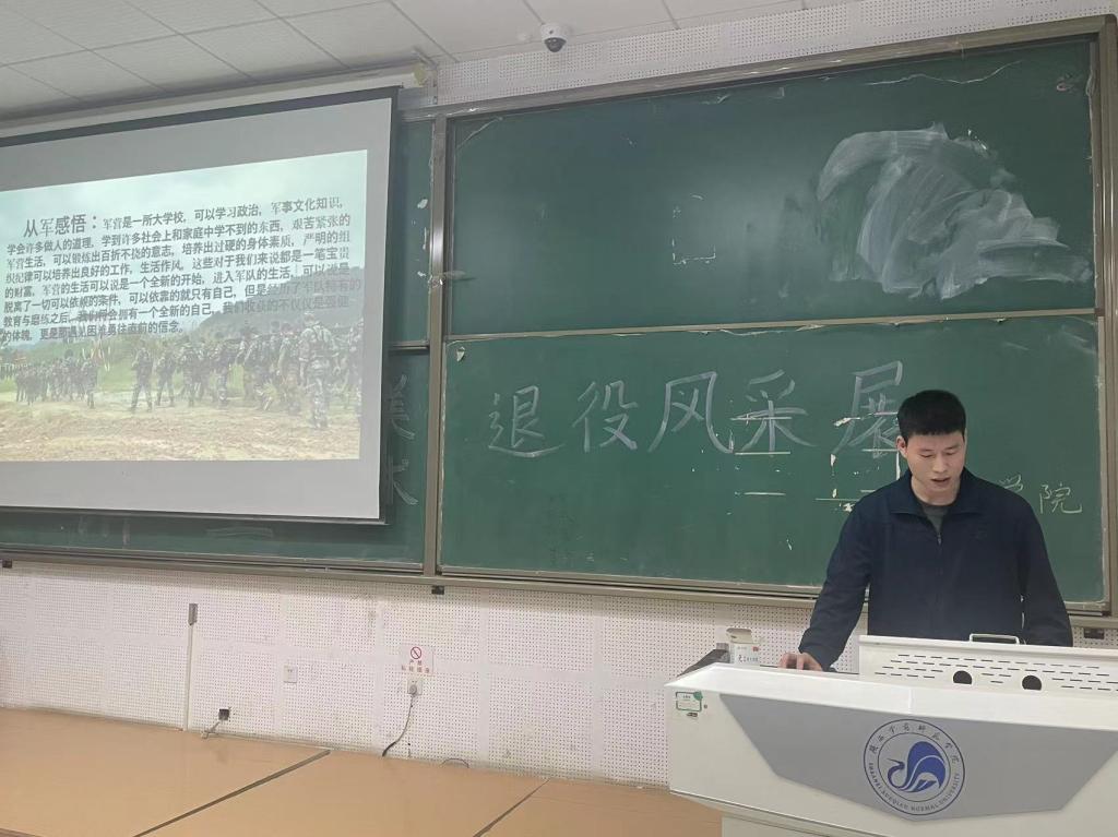 为宣传大学生参军入伍政策,激发学生们报效祖国、献身国防的热情,5月5日至5月8日,我院先后在一号教学楼307、309、404室开展了“退役风采展”主题宣讲活动。由优秀退役士兵张鑫炜主讲。宣讲人以PPT和视频的形式分享了应征入伍的经历与收获,展示在部队的风姿和丰富多彩的军旅生活,并向同学们详细讲解了大学生应征入伍的流程和优惠政策,鼓励同学们积极响应国家号召,携笔从戎,参军报国,勇作新时代的弄潮儿,投身到军队和国防建设中去。