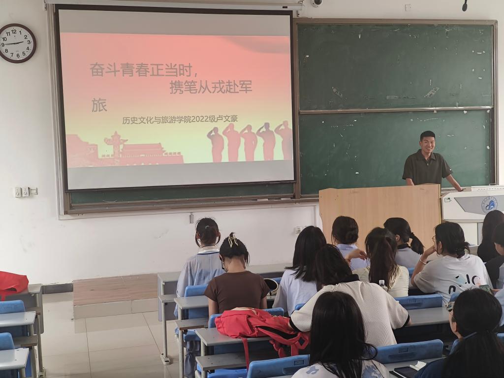 2023年5月25日,文学院在智慧楼阶4教室开展“学长讲堂”“退役风采展”的主题宣讲,2020级全体学生参会,会议由辅导员康乐主持。