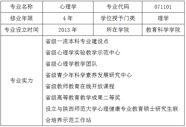 心理学是申搏建校以来的传统优势学科和重点建设学科之一,1978年开始心理学教学与专业建设工作。2003年获准招收心理咨询专业专科生;2013年获准招收心理学专业本科生;2014年获批省级教学团队;2015年获批校级综合改革试点专业;2016年获批省级实验教学示范中心;2017年,心理学专业遴选为陕西省本科“一流专业”培育项目;2019年,心理学专业获批为陕西省本科“一流专业”建设项目。2018年与陕西师范大学联合培养心理健康教育专业硕士研究生工作。