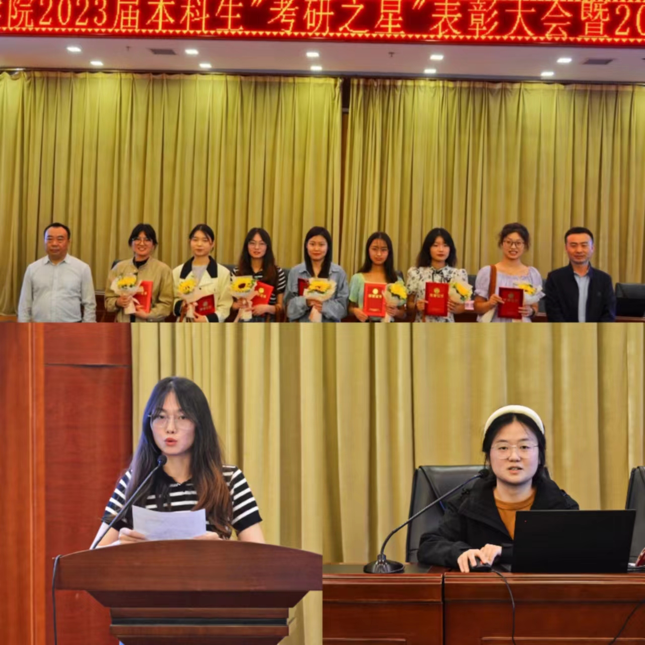 会上,学院党委副书记苏群宣读了《幼儿教育学院关于表彰2023届毕业生“考研之星”的决定》。随后,2024届学生代表给受表彰的学长学姐送上鲜花表达真诚的祝福;何院长和王书记一起为考研优秀学生颁发“考研之星”荣誉证书并赠送学院精心挑选的礼物——《陈鹤琴文集》和《3~6岁儿童受教育权保护研究》2本关于学前教育专业的书籍和一支派克钢笔,希望即将步入新学府继续深造的同学,继续努力,探索新知,不断超越自我,努力成为学前教育领域的大家,以笔书写美好的未来。