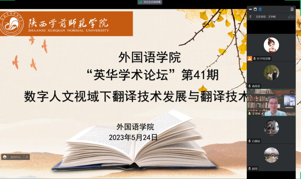 5月24日下午,北京外国语大学王华树教授应邀做客外国语学院“英华学术论坛”第41期,作了题为《数字人文视域下翻译技术发展与翻译技术应用》的学术报告。本次学术报告由外国语学院王雨副院长主持,申搏师生100余人以腾讯会议在线方式参加。