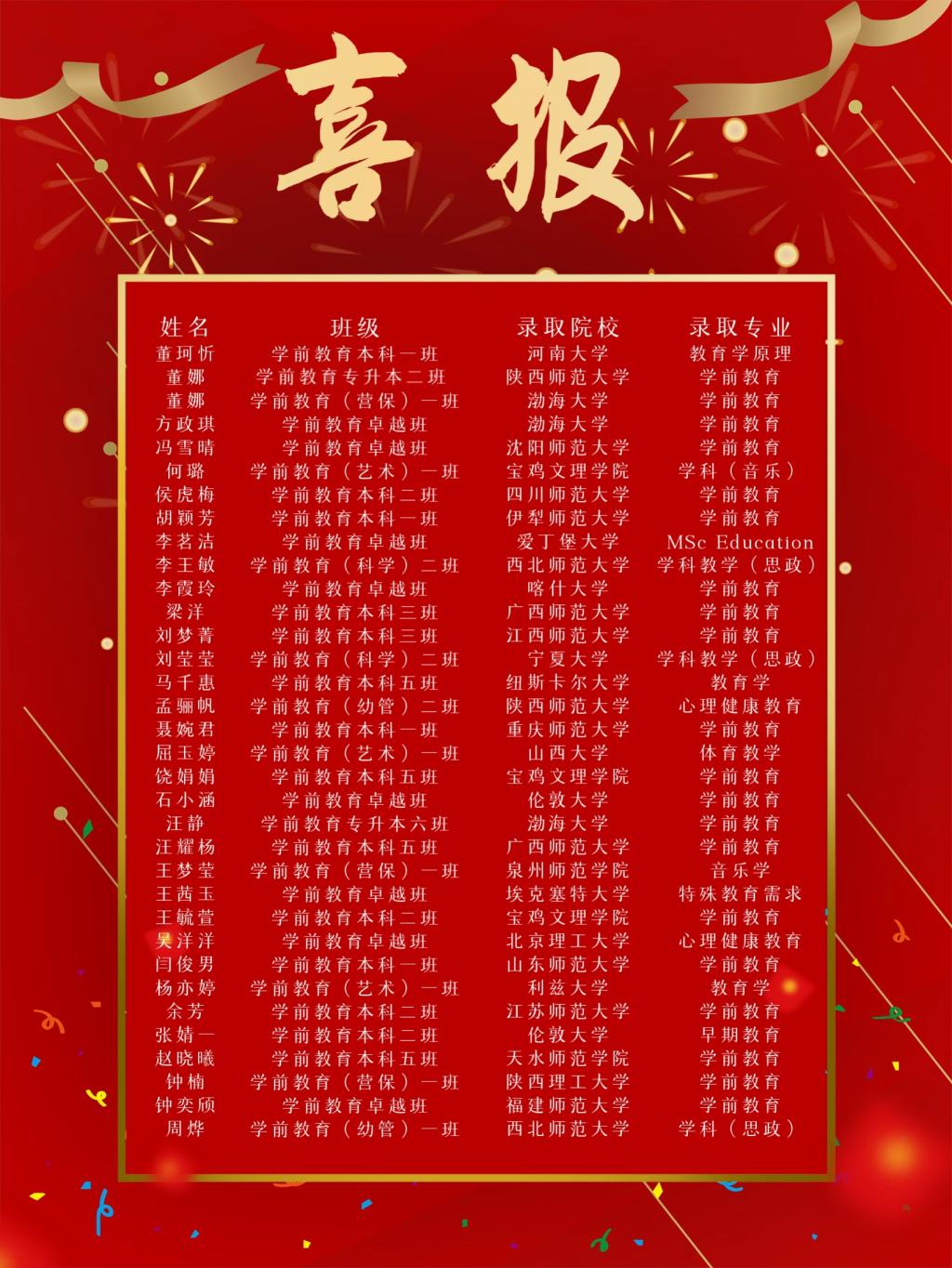 随着2023年全国硕士研究生入学考试复试结果的陆续公布,幼儿教育学院2023届学子们的考研录取喜报也纷纷传来。幼儿教育学院2023届毕业生锐意进取,再创佳绩。共有28名同学考取国内各大高校的研究生,6名同学获得了出国留学的机会。