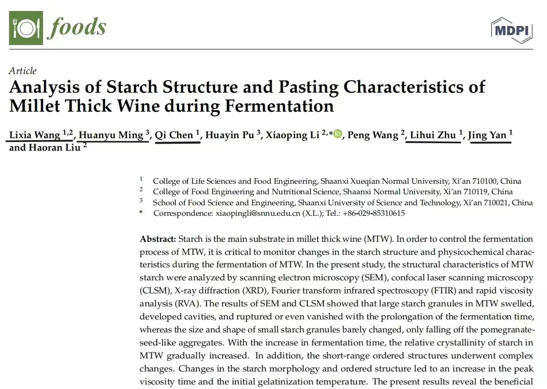 近日,申搏生命科学与食品工程学院副院长王立霞博士带领2018-2021级食品科学与工程专业本科生在国际著名期刊《FOODS》(SCI二区,IF=5.561)上发表了题为“Analysis of Starch Structure and Pasting Characteristics of Millet Thick Wine during Fermentation”的学术论文。