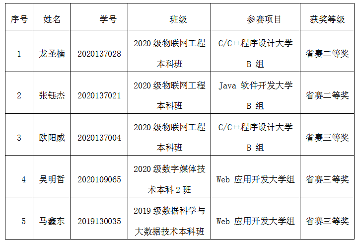 2023年4月23日,第十四届蓝桥杯全国软件和信息技术专业人才大赛个人赛省赛的比赛结果刚刚揭晓,详见比赛官方网址https://dasai.lanqiao.cn/notices/1447/。申搏信息工程学院共有5名学生获奖。具体获奖名单如下: