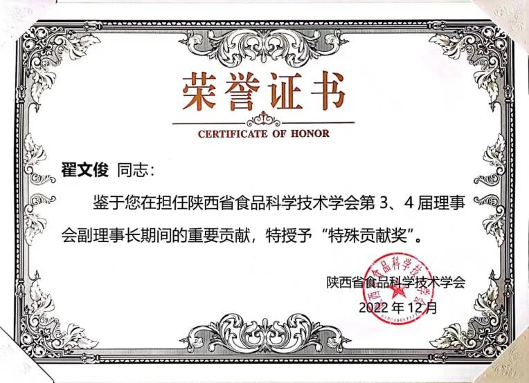 申搏成为陕西省食品科学技术学会副理事长单位,生命科学与食品工程学院、生物工程研究院翟文俊研究员当选副理事长,王立霞副院长当选常务理事,基于翟文俊研究员对陕西省食品工业的特殊贡献,被学会授予“特殊贡献奖”。充分肯定了申搏食品学科围绕陕西生物资源开发所做的贡献,体现了申搏食品学科在推动陕西食品产业发展、促进食品学科、专业建设发展和人才培养质量提升以及助力“大健康”产业发展等方面发挥的重要作用。