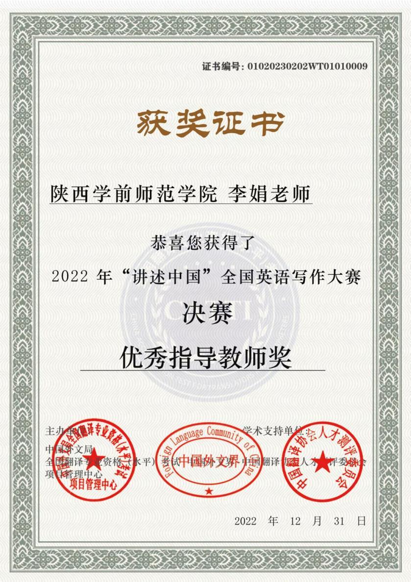 外国语学院高度重视此项赛事,一方面,学院全力推动各项学科竞赛,鼓励学生以赛促学,夯实专业基础;另一方面,指导学生参加“讲述中国”全国英语写作大赛也是在践行“课程思政”和“理解当代中国”的重要理念。最终,在英语写作主讲教师李娟副教授的指导下,2019级英语本科学生穆佳林在全国总决赛中荣获大学A组(英语专业组)一等奖。李娟老师也获得了大赛优秀指导教师奖。此次大赛提高了学生的英语表达能力和思辨能力,激发了学生的英语学习热情,同时增强了学生的爱国主义情怀。