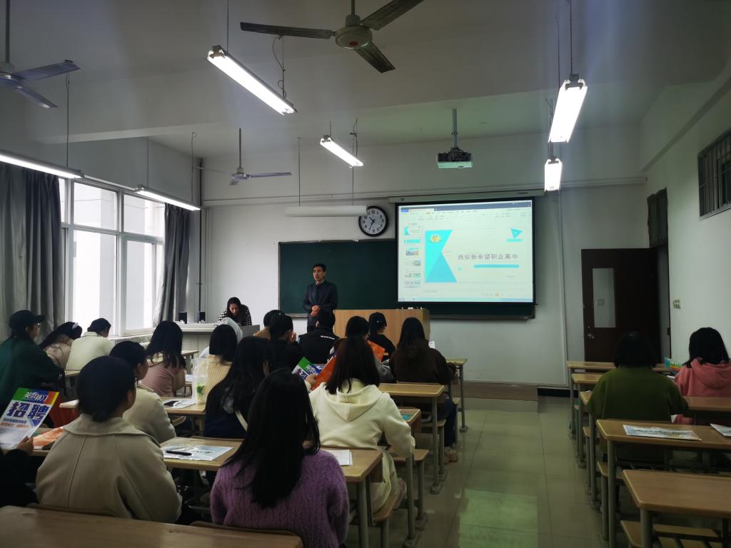 座谈会结束后,英泰教育校长陈江涛与新希望职业高中校长方明伟在文博楼A302教室作了招聘宣讲,向与会的毕业生详细介绍了本单位的具体情况,并就毕业生关心的上岗条件、招聘流程和福利待遇等问题进行了详细说明。当日下午,该集团下属的西安虹途职业高中、新希望职业高中、英泰补习学校等三家用人单位进行了现场招聘面试,2023届毕业生踊跃报名、积极应聘,最终约有70名学生参与了面试。