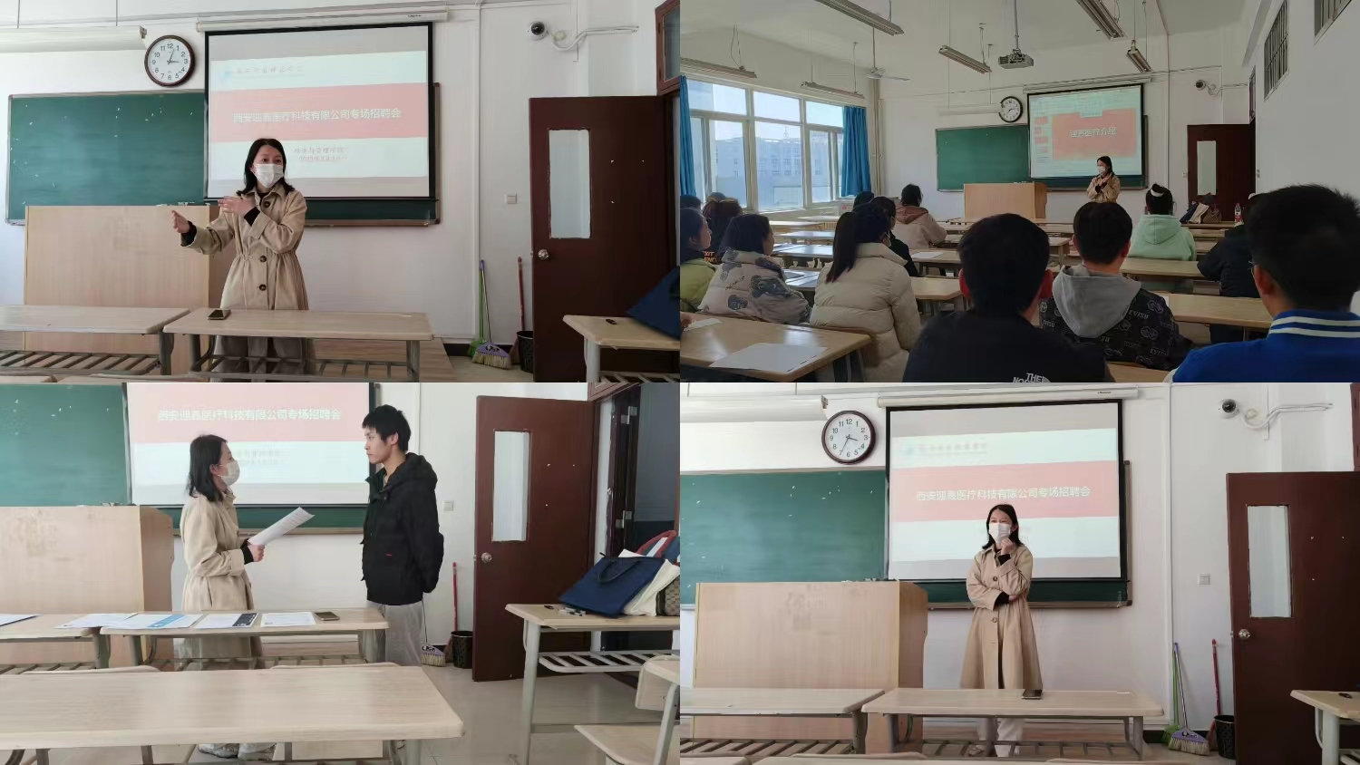 招聘会伊始,西安市迎鑫医疗科技有限公司人力资源部任淼女士向与会同学们详细介绍了公司自建立以来的发展历程,结合不同岗位需求向同学们就公司的规章制度、福利待遇、企业文化、组织构架等方面做了重点讲解,并现场解答了同学们关心的相关问题。招聘活动现场气氛活跃,毕业生参与度高。在宣讲环节结束后,用人单位对现场投递简历的学生进行了首轮面试。