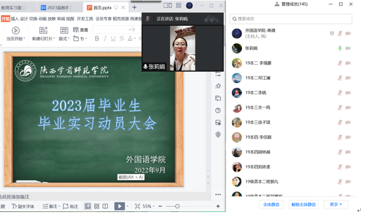 受疫情影响,9月21日下午,外国语学院利用腾讯会议在云端举办了2019级全体学生教育实习行前动员大会。会议由英语系高倩老师主持,张莉娟副院长参加并讲话。