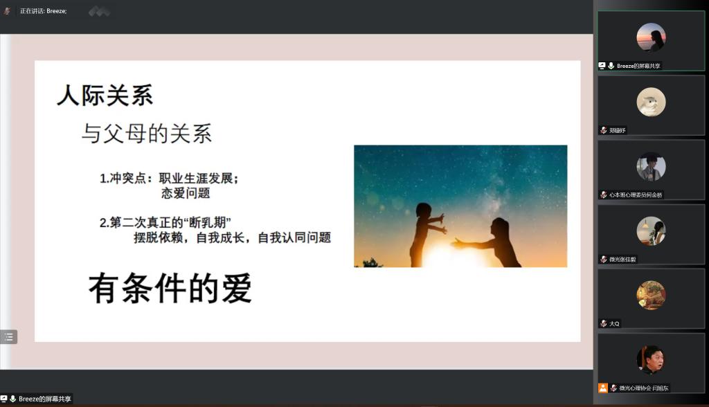 为提升申搏2022级新生心理委员心理素养和助人能力,学生处于2022年11月30日下午2点开展了2022级班级心理委员第三场线上培训。大学生心理健康教育与指导中心教师李玉担任本次主讲。2022级各班心理委员、微光心理协会成员共同参加。