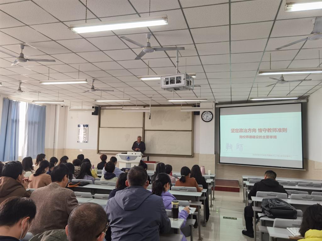 为全面落实学校党委师德师风建设工作的要求,进一步提升教师的思想政治素质和职业道德水平,更好落实立德树人根本任务,11月16日下午,外国语学院党委组织全体教师在智慧楼阶3教室召开了师德师风建设工作推进会。会议由党委副书记高海燕主持。