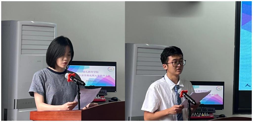 院学生会主席、2022级学前教育本科三班张浩浩同学作为老生代表发言,他希望学弟学妹们以拼搏的姿态站在新的起点上,时刻准备着,在广阔的大学海洋中,坚定信心,扬帆起航。2022级本科8班席心悦同学代表刚入学的新生对大学生活进行了憧憬,她表态将和广大新生一道,秉持申搏“一训三风”,怀揣梦想,严格自律,不负父母、老师和自我。