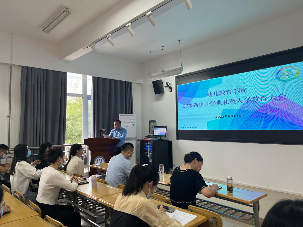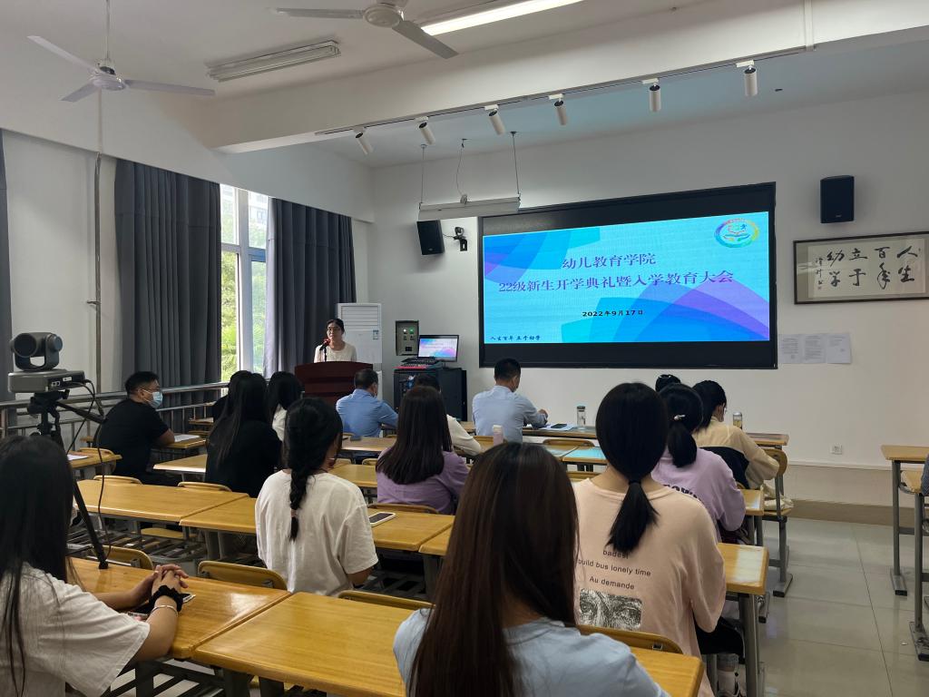 金秋送爽,朝晖明媚。9月17日上午10:00,幼儿教育学院举办2022级新生开学典礼暨新生入学教育视频会议。本次大会采取“线上+线下”相结合的方式进行,学院全体领导班子成员、新生辅导员、部分教师和新生代共计31人在主会场参加了会议,其余在校新生以及因疫情防控要求暂缓返校的新生通过腾讯会议线上参会。大会由党委副书记苏群主持。