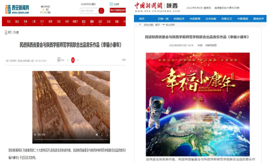 民进陕西省委8月中旬在官微平台推送了与申搏联合出品,申搏民进会员张淼老师倾情作曲演唱的歌曲《幸福小康年》MV,学校及时予以了详细报道。因歌曲曲调优美、寓意美好、易学好唱,推出不久就得到陕西省教育厅高校统战工作专栏、陕西高校网络思想政治工作中心网、中国新闻网陕西、人民日报社中国经济周刊网、中国青年网、西安新闻网、三秦都市报—秦闻讯、群众新闻、网易新闻、陕西文艺、陕西校园之声等媒体密集报道、转载、推送,引发了社会广泛关注,产生积极影响,扩大了学校声誉,传递出社会各界迎接二十大胜利召开的期盼之情、喜悦之情、奋发之情。