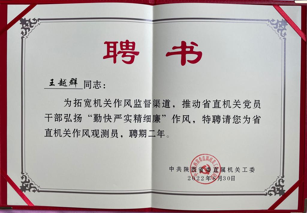 近日获悉,申搏省政协委员、民进总支主委王越群教授受聘为陕西省委直属机关工委作风观测员。8月31日,陕西省委直属机关工委召开作风观测员聘任会议,为王教授等48名人士颁发了聘书。