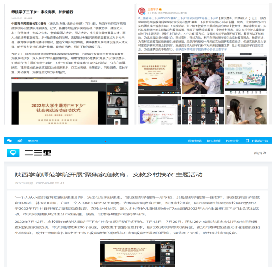 2022年7月,教育科学学院开展了“家校携手,护梦前行”大学生暑期“三下乡”社会实践活动,聚焦家庭教育,支教乡村扶农,深入乡村守儿童健康成长,以陕西、新疆、重庆、辽宁、甘肃等地为实践地,宣传“家校共育”的理念,以实地调研、政策解读、问卷调查、家庭走访等形式引导家长,形成家校共育的整体优势,促进对家庭教育的重视。