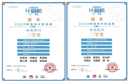 2022年8月,由全国高等学校计算机教育研究会主办的“中国高校计算机大赛——2022网络技术挑战赛”西北赛区获奖名单公布,信息工程学院学生在学院领导的大力支持和教师的精心指导下,共斩获三等奖2项。