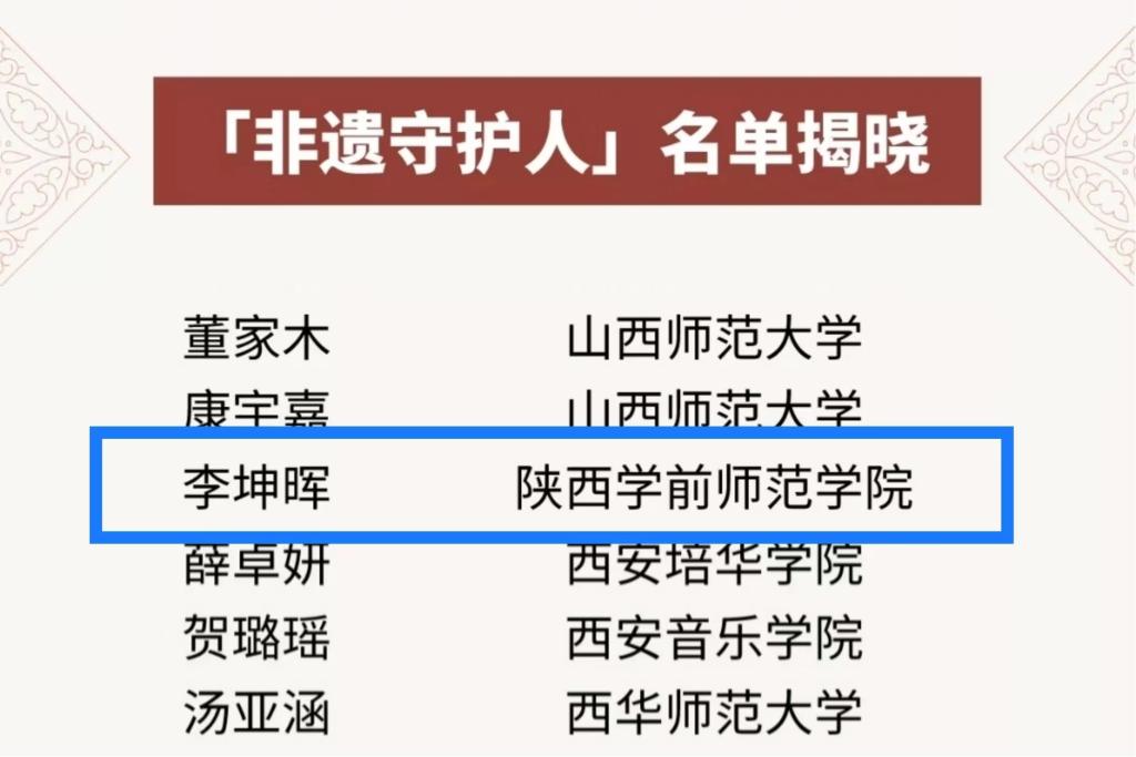 申搏“秦风鼓乐社”社团社长——音乐学院2019级音乐学本科三班李坤晖同学成功入选,成为全国百名高校“非遗守护人”之一。