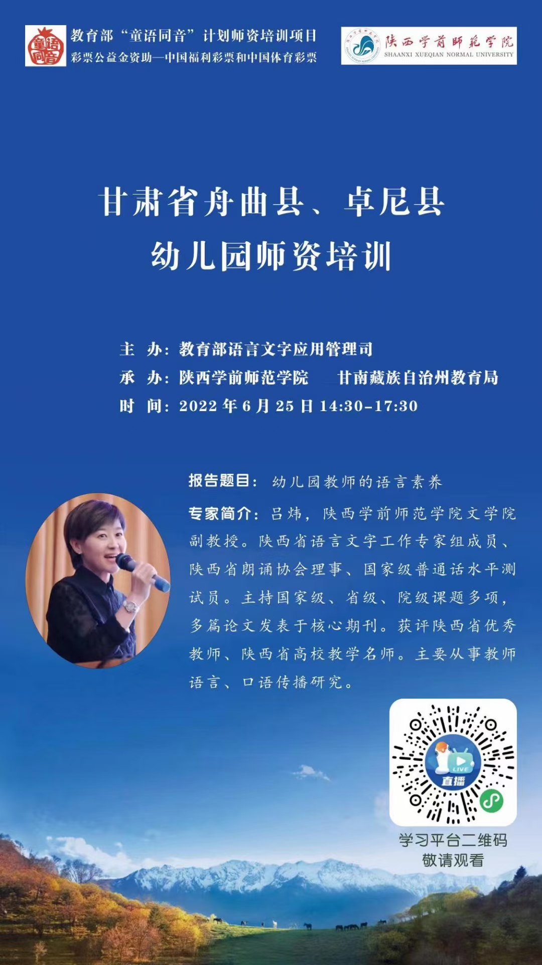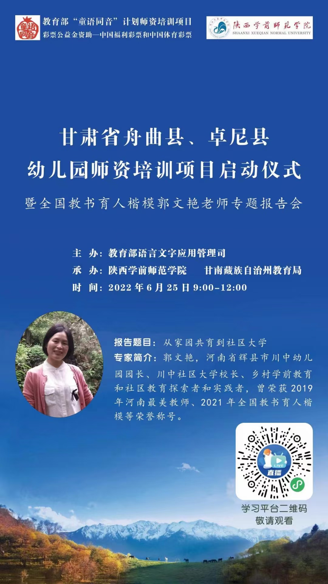 教育部“童语同音”计划师资培训工作旨在通过对农村幼儿园教师开展国家通用语言文字应用能力培训,加强学前儿童普通话教育,助力乡村振兴,服务铸牢中华民族共同体意识。申搏承办的甘肃省舟曲县、卓尼县幼儿园师资培训分为集中培训、分组研修、送培到县等三个阶段。集中培训阶段,北京师范大学、陕西师范大学、西安市知名幼儿园及申搏专家将带来14场精彩报告。分组研修阶段将根据学员实际情况,通过分组教学,定制个性化普通话提升方案,推动舟曲县、卓尼县幼儿园教师国家通用语言文字能力不断迈上新台阶。