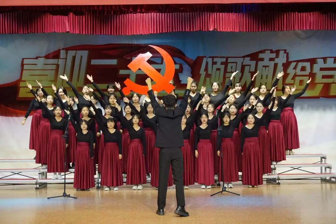 那鲜红的旗帜,正是指引我辈青年前进的灯塔,开场舞《我心中的红》,拉开了本次合唱比赛的帷幕。赛场上,各个班级将歌声带上舞台,将歌声与祖国紧密相连,在旋律、舞蹈、朗诵、琴音、口号的碰撞融合中,给观众带来了一场视听盛宴。飞扬的歌声,吟唱难忘的岁月,熟悉的旋律,演绎时代的激越,一首《我和我的祖国》道出无数中华儿女的心之所向;以青春之名诠释清澈挚爱,献礼建党百年华诞!一曲《万疆》,勾勒山河无恙的盛世景象;唱支山歌唱出亿万华夏儿女的心愿给党听,我把党来比母亲;母亲只生了我的身,党的光辉照我心,一首《唱支山歌给党听》;听,风在吼,马在叫,九曲黄河正将万顷波涛凝聚成一首雄壮的战歌!一曲《黄河大合唱》,表达了华夏儿女誓死保卫祖国的坚定决心……一声声歌唱祖国道出了对祖国母亲深深的爱,一曲曲红歌嘹亮唱出了意气风发的少年模样,一次次深情朗诵诉出了对红色精神的无悔传承。合唱比赛如火如荼地进行着,现场气氛在嘹亮的歌声中不断被推向高潮。