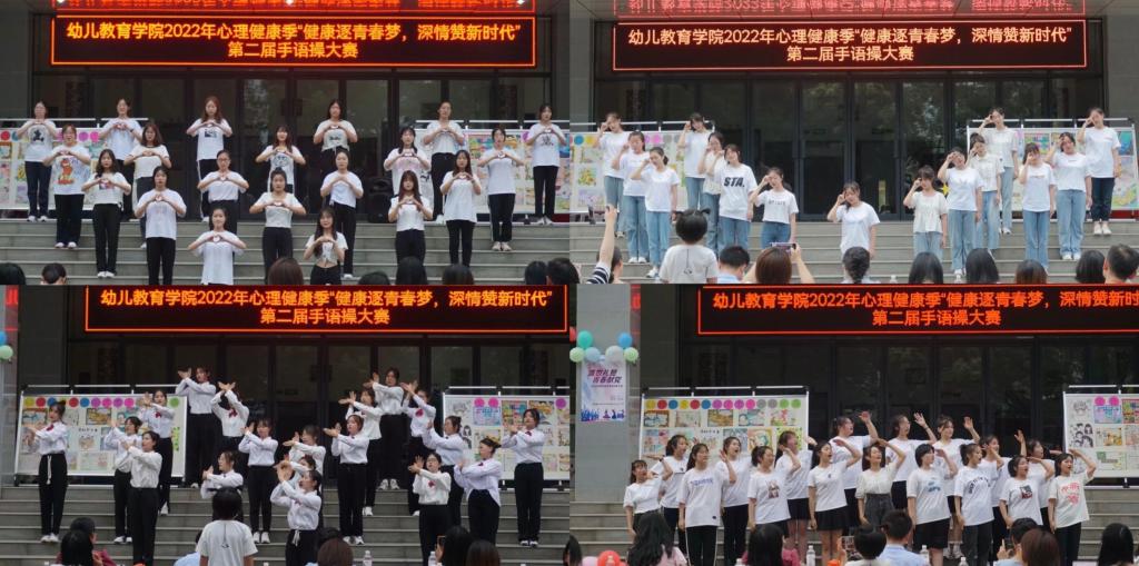 为进一步加强我院大学生心理健康水平,丰富大学生课余生活,引导学生关注心理健康,更好的展现大学生积极进取的精神面貌,在学生中倡导关爱身心健康,树立积极健康观,培养健康生活方式等理念,创建心理健康的良好氛围。2022年6月2日18:00,幼儿教育学院在启真楼前举办“健康逐青春梦,深情赞新时代——幼儿教育学院第二届手语操大赛”,幼儿教育学院2021级、2020级和2019级共13个班参加了比赛。出席本次大赛的评委有来自幼儿教育学院的学前心理与管理系主任唐海朋老师、张瑶老师、成倩老师、学前课程教学系老师焦惟老师、院党委副书记苏群老师;此外,出席本次大赛的还有幼儿教育学院党委书记(主持工作)王继康和幼儿教育学院全体辅导员。