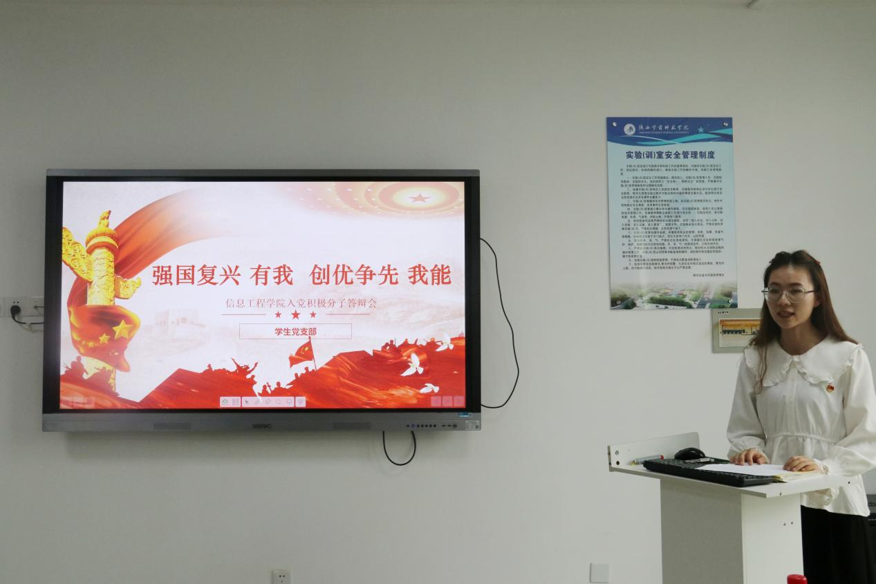为深入贯彻习近平新时代中国特色社会主义思想,增强基层党组织建设,严格党员发展程序,坚持党员教育、管理、监督、服务相结合,不断增强党员教育管理的针对性和有效性,不断提升党员队伍建设质量,保持党员队伍的先进性和纯洁性,信息工程学院学生党支部于2022年5月18日在积学楼A401、A404,分两个会场举办主题为“强国复兴有我 创优争先我能”信息工程学院2022年首期入党积极分子答辩会。此次答辩会的委员会由院党委副书记、院副处级组织员、辅导员及培养联系人代表、支部委员组成,50期、51期入党积极分子观摩学习。