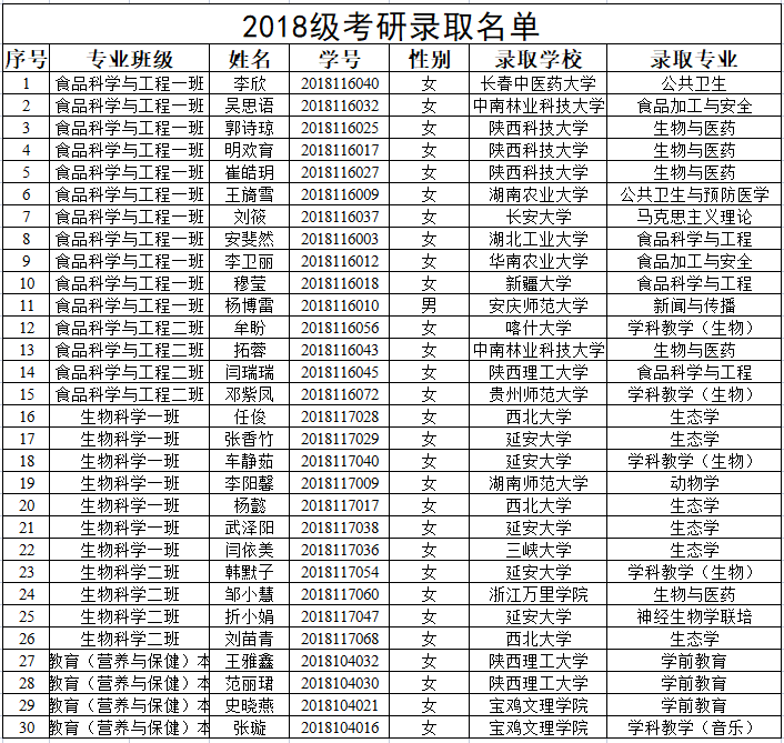 在生科院师生的共同努力下,2022年研究生考试到录取喜报频传。截止目前,2018级考研学生录取工作已全部尘埃落定,本届本科毕业生共188人,录取30人,其中西北大学录取3名,长安大学录取1名,延安大学录取5名。食品科学与工程一班共34人,考研11人,比例高达32%,成绩喜人,本届毕业生考研录取率创我院历史新高。