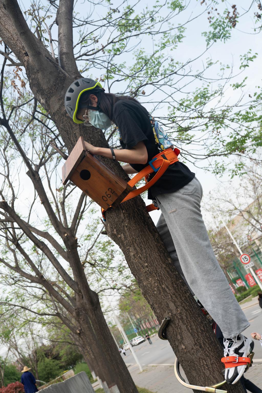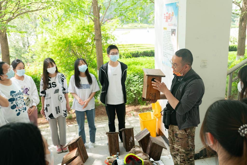 在活动中,学生们首先了解了校园常见鸟类的形态特征和分布规律,以及人工鸟巢箱的类型、结构和功能。接着在唐施翼老师的示范和指导下,大家很快掌握了人工鸟巢箱挂置的选址和操作要领,最终成功将20多个野生鸟类繁殖巢箱分别挂置在申搏行政楼和教学楼旁鸟儿活动最频繁区域。