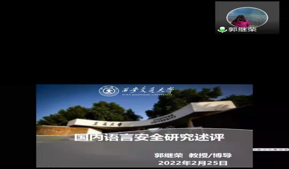 西安交通大学郭继荣教授报告题目是“国内语言安全研究述评”,他通过解读党的十九届五中全会中关于国家安全的内容要求,抛出三个值得大家思考的问题:“语言安全的范畴和主体是什么?”“语言问题如何影响国家安全?”“如何通过语言安全规划来维护和塑造国家安全?”随后,他介绍了我国语言安全研究的三个阶段,即国家安全语言战略初探、总体国家安全观下的语言安全研究以及疫情期间的语言安全研究。接着,他谈到我国语言安全研究的反思,阐释了安全与安全化、语言安全的概念分歧、语言安全的定义等概念,并从四个方面分析了国内语言安全研究的概念。最后,他对未来研究进行展望,并提醒老师们关注少数/跨境民族的语言使用现状及语言安全挑战、网络空间语言竞争与语言暴力等问题的语言治理、疫情期间国家应急语言能力建设以及全球治理背景下语言如何助力全球构建一个更加安全的命运共同体等研究议题,这些都是未来的研究增长点,值得进一步探索。