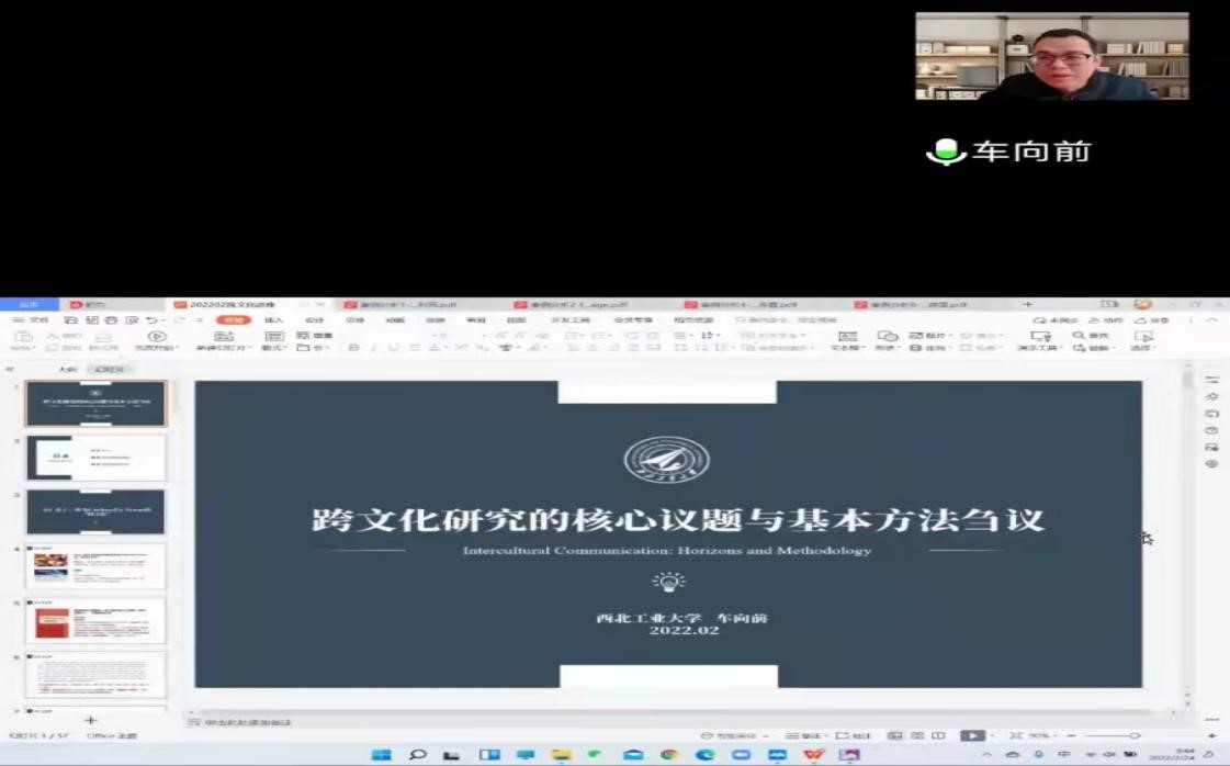 西北工业大学车向前博士报告题目是“跨文化研究的核心议题与基本方法刍议”。 车博士首先提出了两个问题供老师们思考:跨文化是学科吗?这么多“跨文化”到底关注了什么样的问题?他为大家分析讲解了国务院学位委员会《学位授予和人才培养一级学科简介》中关于外国语言文学专业的介绍部分,并指出跨文化研究并不是一个学科,而是一种理念,正因如此,更有必要廓清研究的核心议题、聚焦问题和基本视域。接着,他通过理论结合实际的方法重点分析了跨文化研究的五个核心议题,即文化差异与文化对话、文化身份与文化记忆、文化伦理与文化安全、文化形象与文化故事和跨文化能力与文化融入。随后,车博士又为大家介绍了跨文化研究的基本方法,包括比较研究、跨文化阐释、交际民族志、内容分析等方法。最后他总结到,文化已不再是自我封闭和固执于时空中的‘门户之见’,而是一种永不阖闭的自我意识敞开形式。