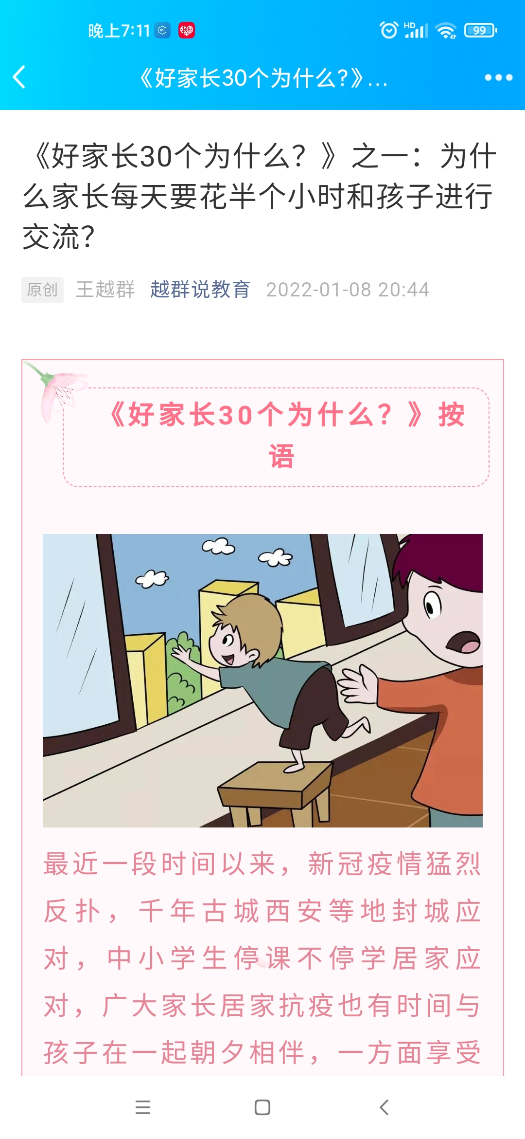 岁末之际,新冠疫情猛烈反扑,古城西安等地封城应对,中小学生停课不停学居家应对,广大家长居家抗疫也有时间与孩子在一起朝夕相伴,一方面享受了更多与孩子相处亲情幸福,另一方也增多了与孩子之间磕磕碰碰的频率,幸福与烦恼同时涌上心头,期盼着针对孩子教育的具体问题能够有良方相解。申搏民进主委王越群教授牢记参政党职责使命,心系学生成长,计划陆续推出30篇所撰家庭教育系列千字小文《好家长30个为什么?》,希冀对广大中小学生家长和老师及家庭教育爱好者有所裨益,现在已推送第一讲。
