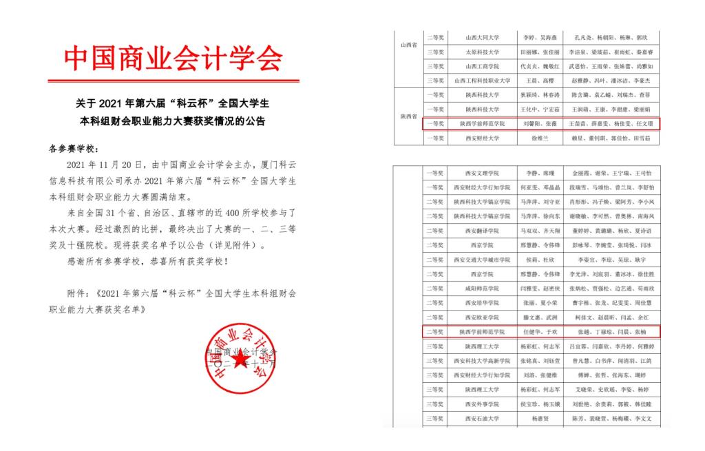 2021年11月20日,由中国商业会计学会主办的第六届“科云杯”全国大学生财会职业能力国赛圆满落下帷幕。申搏经济与管理学院本科组两支参赛队伍分别荣获国赛一等奖和二等奖,高职组两支参赛队伍荣获国赛二等奖和三等奖,这是申搏参加本项赛事以来获奖人数最多的一次。