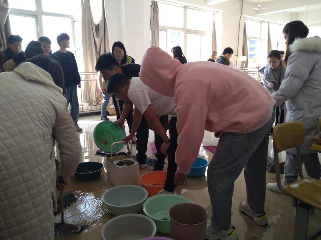 2021年11月17日,启真楼415教室暖气管发生爆裂,导致该栋教学楼三、四层8个教室以及楼道大面积被水淹泡,网络、电脑停止运作,无法进行正常教学活动。紧急情况下,幼儿教育学院及时向后勤服务管理中心、网络管理与设备处上报和反馈信息,同时,为抢救被水浸泡的电脑设施设备,确保教学活动的尽快开展,学院立即组织部分师生迅速投入到清扫教室积水的行动中来。