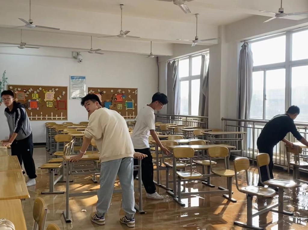 由于此次积水较为严重、涉及教室多,面积大,屋顶还不时的滴水,给清扫带来了很大障碍,师生们群策群力,纷纷利用从办公室、各个教室征集来的扫把、簸箕、垃圾桶进行一点一点的清理,有的用簸箕铲水,有的用挡板推水。由于没有专门的盛水工具,同学们纷纷贡献出宿舍用的水桶、脸盆进行集中盛水。辅导员老师们带领同学们分别包干到教室,先将桌椅集中堆放,给清扫腾出较多空间,再集中人力对地面、讲台下面进行清扫。老师们、同学们的鞋子、裤脚都被水浸湿了,却依然投入到紧张的清扫工作中......
