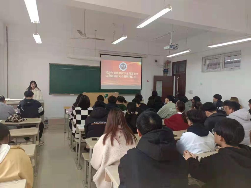 为进一步加强学生自我安全意识,提高自我管理能力,确保学院安全稳定,2021年11月17日下午,经济与管理学院在博文楼b座401教室召开寝室安全知识培训会议暨学生安全信息员聘用仪式。学院党委副书记陈璐、学工办主任艾菁、辅导员吴思瑾、辅导员肖欢以及各年级安全信息员参加了本次会议。会议由学院学生会执行主席屈叶子同学主持。