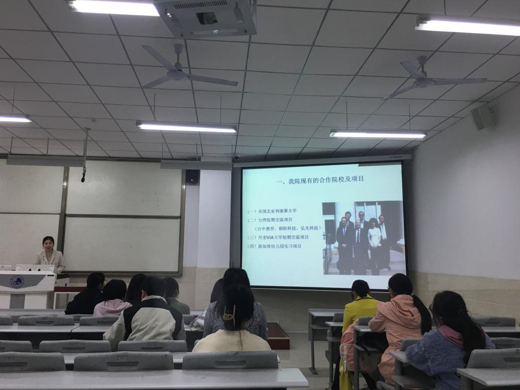 国际处工作人员首先介绍了申搏现有的合作院校概况、项目具体内容、申请流程、相关费用。随后重点介绍了美国北亚利桑那大学的“2+2”双学位项目、丹麦VIA大学学院的短期交流项目、三所台湾大学的合作项目以及新加坡就业项目。最后展示了一些留学生的生活剪影和学习体验,加深学生对国境外交流学习的认识和了解,激发了学生参加国际交流的热情和兴趣。
