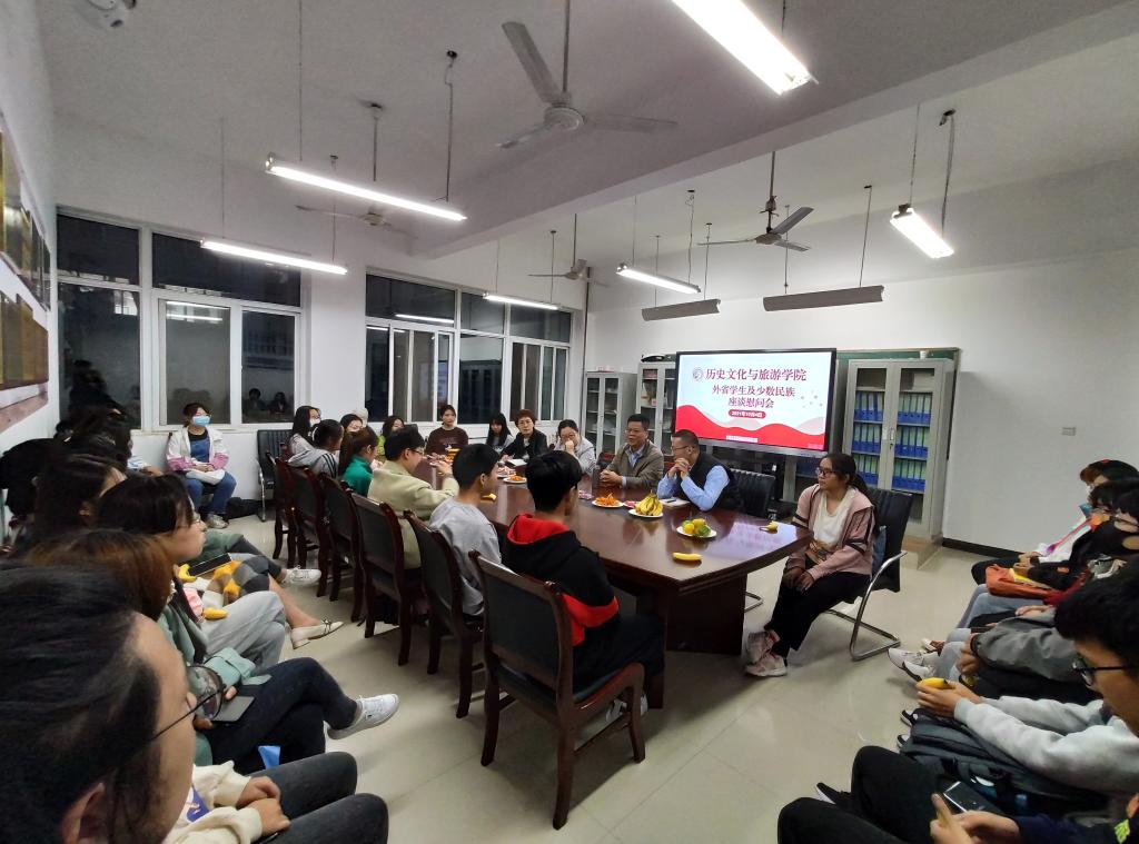 国庆节期间,为庆祝新中国成立72周年,了解学生思想、学习、生活方面的动态,促进少数民族同学之间的交流融合,历史文化与旅游学院于10月4日晚在1教B202会议室召开了以“爱国情·强国志·报国行”为主题的外省籍及少数民族学生座谈慰问会。学院党委书记童广运,副书记景艳,学生党支部书记、学工办主任王黎,2021级辅导员任柏阳及2020级、2021级外省籍和少数民族同学共计30余人参加座谈会。座谈会由学院党委副书记景艳主持。