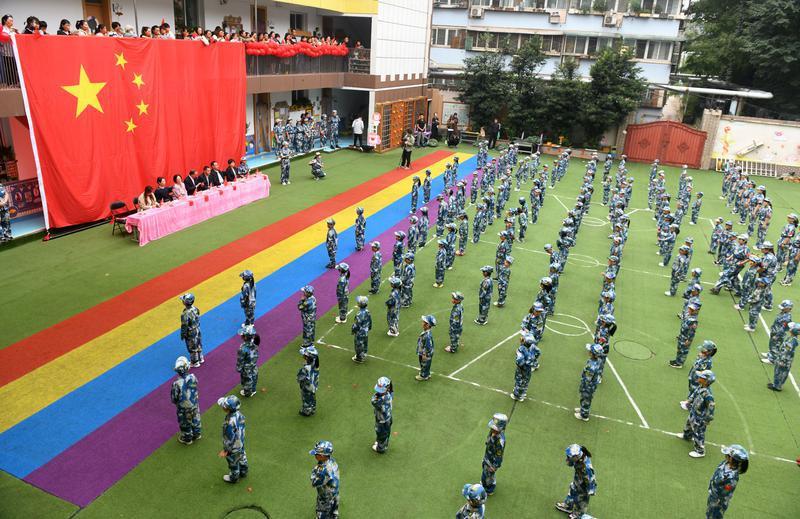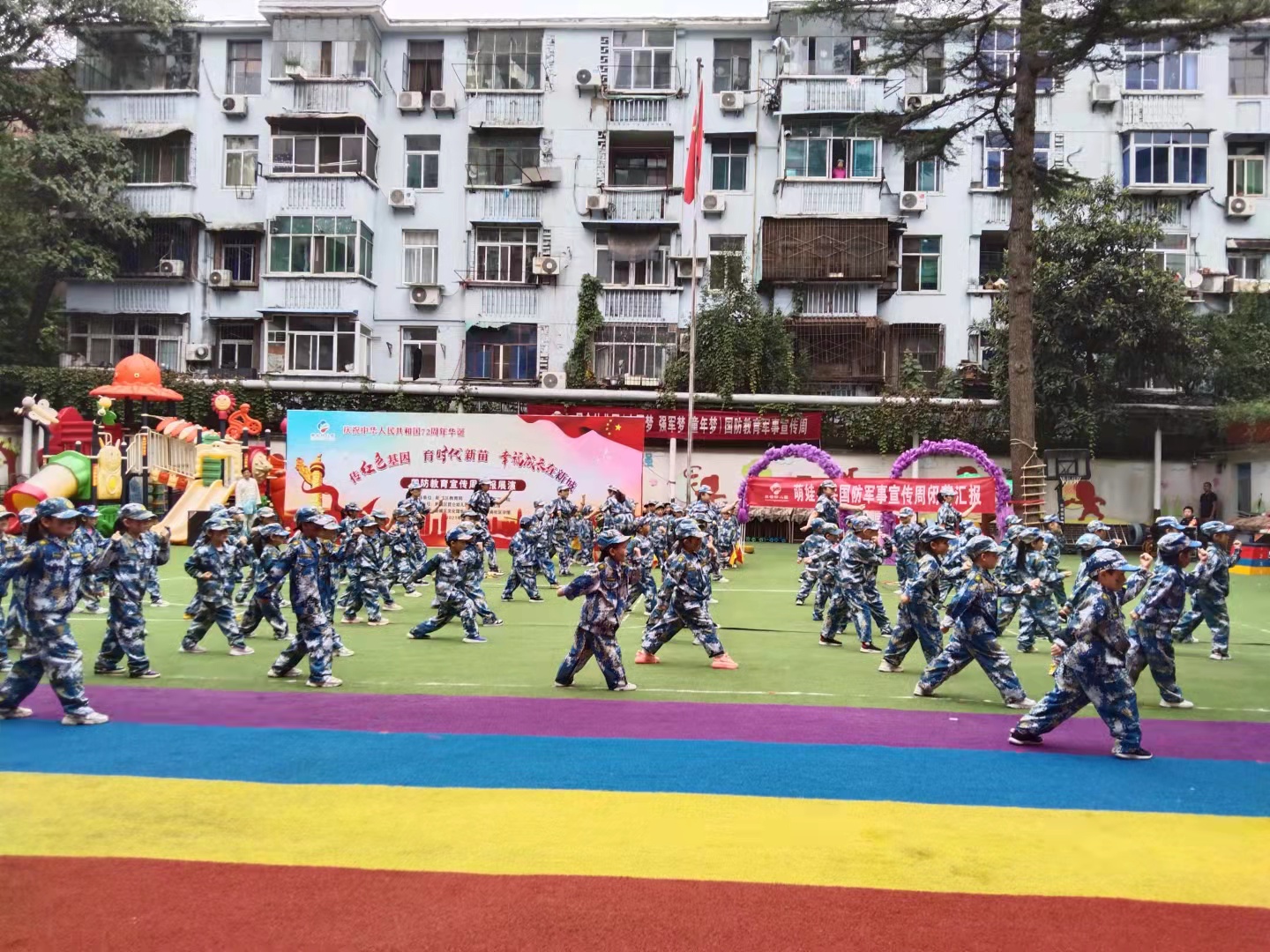 孩子们在进行了为期一周的军事训练后,9月30日上午,举行汇报展演。申搏唐宏副校长、教务处江玉印副处长、省核心价值观培育与红色文化基因传承协同创新研究中心首席专家万生更教授,新城区教师进修学校校长王倩,新城区文化馆馆长易静出席汇报展演活动,与大班的50名家长代表共同见证孩子的成长时刻。