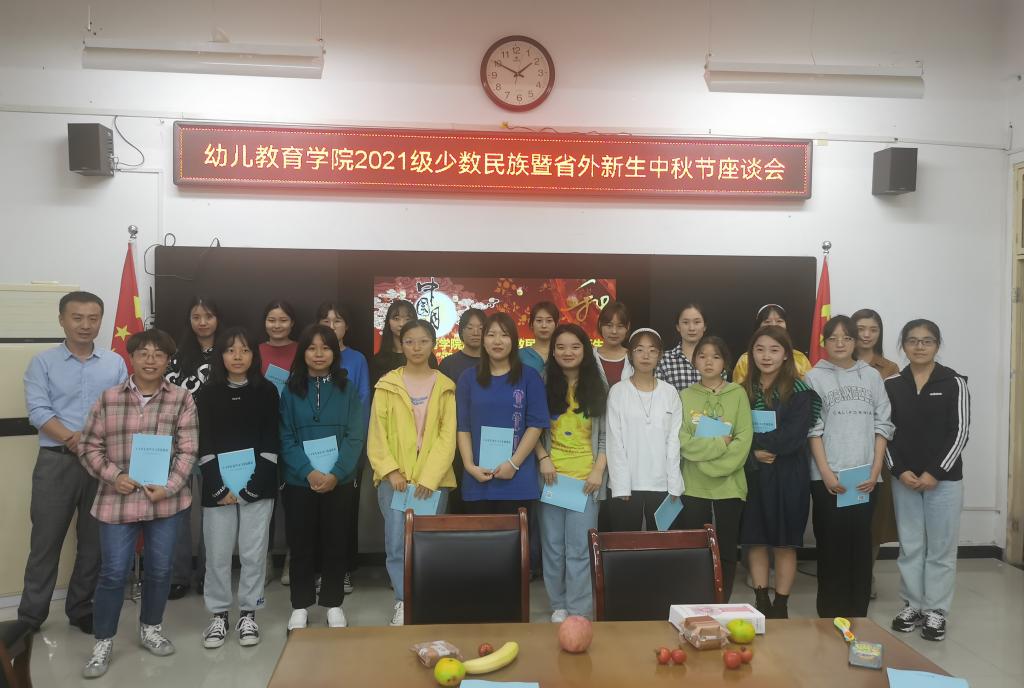 正值中秋、国庆前夕,为了让2021级少数民族新生更快适应学校生活,融入集体,9月18日中午12:40,幼儿教育学院在启真楼307会议室举行了“迎中秋,庆国庆”少数民族暨省外新生座谈会。我院党总支副书记(主持工作)王继康,党总支副书记苏群,全体辅导员,以及2021级来自省内外的23名少数民族新生参加了此次座谈会。