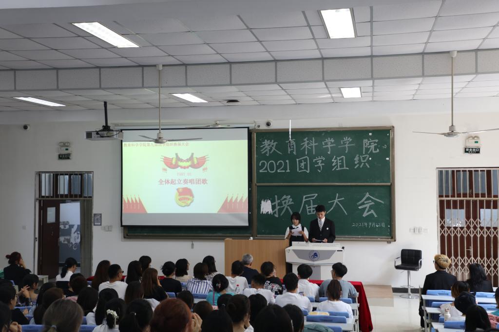 2021年9月22日中午,教育科学学院第九届团学组织换届大会暨学生会工作人员培训开幕式在一教楼阶B1召开。教科院党总支副书记刘然,教科院团总支书记张书涵,辅导员高薇、赵洋老师,以及本学院团学组织全体人员参加了大会。校级团学组织和其他兄弟学院学生干部受邀出席本次大会。