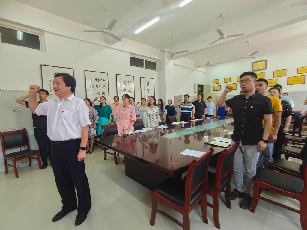 活动中,栾高明副书记带领全体党员重温入党誓词。面向党旗,党员同志们庄严地举起右手,以铮铮的誓言向党宣誓,短短八十字,字字铿锵,句句深意,不断唤醒着每个共产党员的初心与使命,砥砺着每个共产党员忠诚与担当。