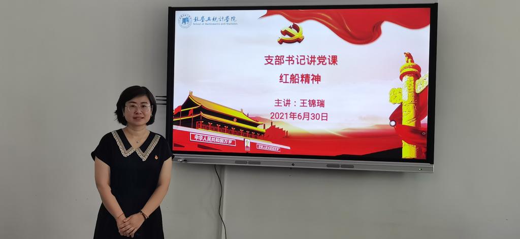 红船劈波行,精神聚人心。6月30日下午3点,数学与统计学院党总支组织全体党员开展“支部书记讲党课”活动,庆祝建党百年,歌颂百年辉煌。数学系党支部书记王锦瑞以《红船精神悟初心 砥砺奋进守初心》为主题,为全体教工党员讲授了专题党课。