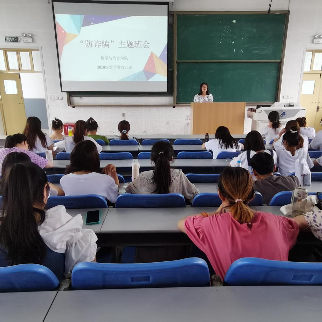6月22日下午,数统院召开全院学生干部安全主题教育班会,不断提高同学们的安全防范意识,全面普及校园安全常识;6月23日中午,各年级辅导员带领学生干部对我院宿舍进行卫生安全大检查,对毕业班宿舍和男生宿舍进行重点检查,对优秀宿舍颁发“优秀宿舍”流动红旗;6月23日下午,在2教C3召开电信防诈骗主题班会,学工办主任何静主讲,从电信(网络)诈骗的概念、情况、现状、形式种类说起,并结合今年大学生受骗案例让同学们了解其基本特征,掌握相关知识,提高自己的防骗安全意识。通过本次防范诈骗讲座提醒同学们,遇到不明信息,一定要做到不轻信、不上当、不转账、及时报警;另外,各年级辅导员积极关注学生的心理问题,通过班级心理委员、班干部,关注问题学生言行、举止,善于发现问题学生,不断疏通问题学生心理。