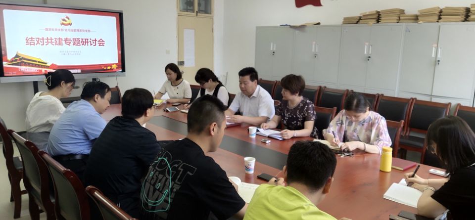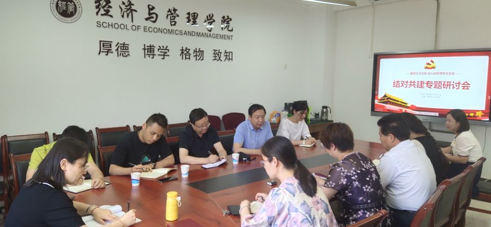 为深入开展党史学习教育,落实为师生办实事的各项举措,促进与二级学院基层党支部合作共建,2021年6月4日上午,机关党委国资处党支部前往经济与管理学院,与学院幼儿园管理系党支部在博文楼B座411会议室召开结对共建专题研讨会。双方围绕“畅谈学习体会,促进合作发展”这一主题进行了交流讨论。机关党委书记郭升团、国资处处长贺继康、国资处党支部全体成员以及经济与管理学院领导班子全体成员、幼儿园管理系党支部书记靳慧芳参加了本次研讨会。研讨会由经济与管理学院党总支书记张建辉主持。