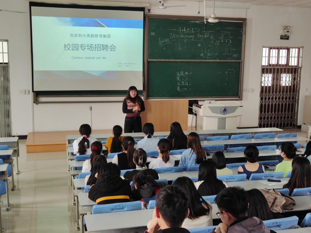 西安科大高新教育集团就业规划师党璠月对在场学生进行招聘宣讲工作。她主要从学校所需求专业,专业对口问题、学校所需求的人才素质问题、未来发展平台与机会等问题与学生进行了交流,对同学们的问题进行了一一作答,解除了同学们的疑惑。她还从简历制作的细节、面试技巧与模拟面试等多个方面为毕业生们进行了指导。招聘老师的宣讲气氛轻松、就业观点新颖、与社会现实结合紧密,深受在场毕业生们的喜爱,同学们纷纷表示受益匪浅,对自身今后求职面试有着重要的指导与帮助作用。