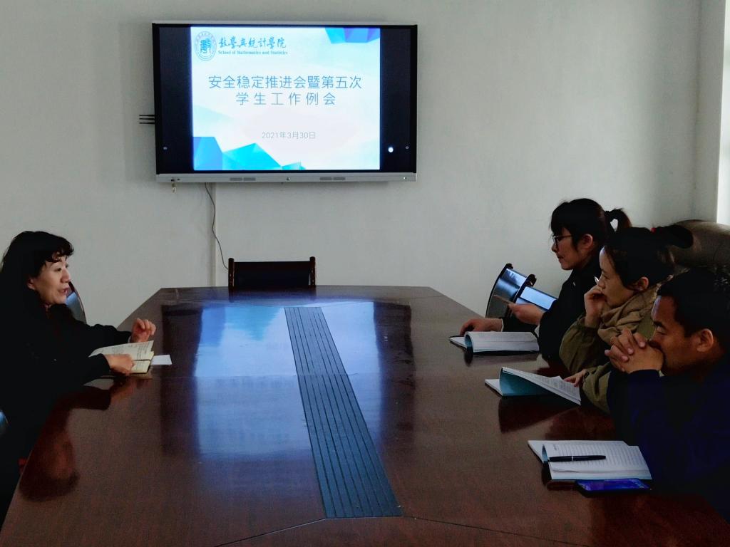 为确保新学期学生教学秩序和生活秩序的顺利开展,维护校园安全稳定,贯彻落实学校2021年全面从严治党暨安全稳定工作会议的精神,数学与统计学院于3月30日下午3点在积学楼319会议室召开了安全稳定推进会暨本学期第五次学生工作例会,学院党总支副书记张晔,辅导员何静、张振华、郭禹含参加了本次会议。
