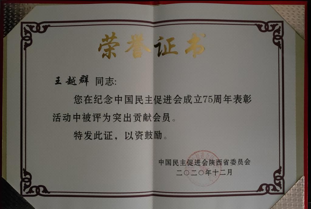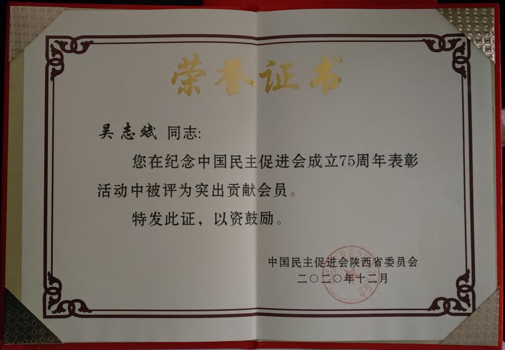 日前,民进陕西省委会在西安召开庆祝中国民主促进会成立75周年纪念大会。陕西省政协副主席、民进陕西省委会主委刘宽忍出席并讲话。中共陕西省委统战部副部长虞浩桂莅临大会并致辞。陕西省委统战部一处负责同志,省委会班子老领导,民进省委会副秘书长,民进陕西省第十二届委员会五次会议参会人员,各市级组织和省直工委的优秀会员代表、突出贡献会员代表以及省委会机关全体干部参加了会议。与会人员观看了中国民主促进会成立75周年光辉历程专题片。大会为获得省先进集体、优秀民进会员、突出贡献民进会员的组织和个人颁发了奖牌和荣誉证书。申搏民进总支原主委吴志斌和现任主委王越群二位同志分别获得"突出贡献会员"荣誉称号。
