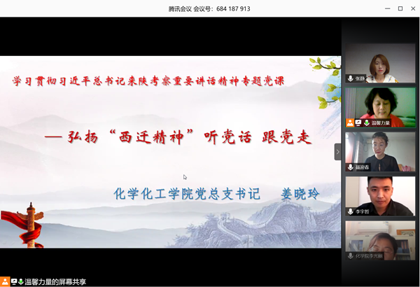 会上,院党总支书记首先对此次会议的主要议程进行了介绍说明,对各支部近期政治理论学习安排和党建活动的开展情况提出了要求。接着,她先是再次领学《习近平总书记在陕西省考察工作结束时的讲话》一文,而后为全体党支部书记主讲了题为《弘扬西迁精神,听党话,跟党走》的云端党课;党课围绕“加强理论学习、提升政治素养”、“强化责任担当、积极主动作为”、“坚持学生中心、落实立德树人”、“牢记使命责任,发挥示范引领”等四点鼓励呼吁老师们要争做新时代“西迁精神”的传播者和践行人。在讲授过程中,她还重点结合《中国共产党支部工作条例(试行)》对支部书记如何在实际工作中组织学习、发挥力量进行阐释和说明,指出《条例》是党支部建设的基本遵循也是支部书记的“工作指导手册”,要学好、用好。党课最后,她借机对学院领导班子成员在各党支部讲授专题党课的工作进行部署安排,并希望支部书记们配合支持,指出要通过专题党课活动继续掀起学习习近平总书记来陕考察重要讲话精神的热潮。