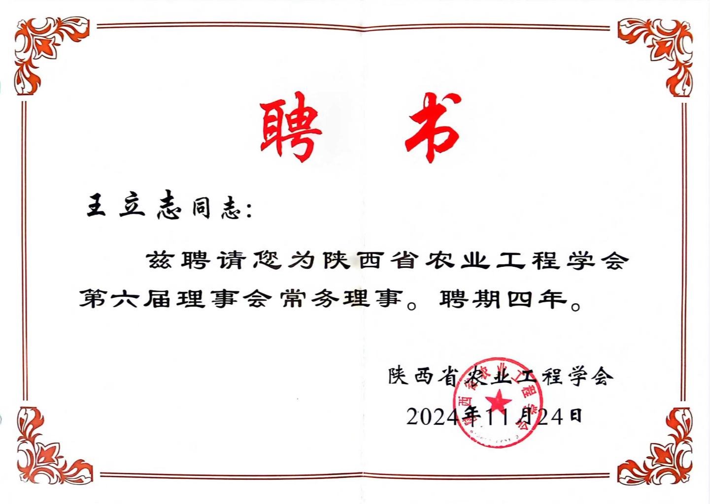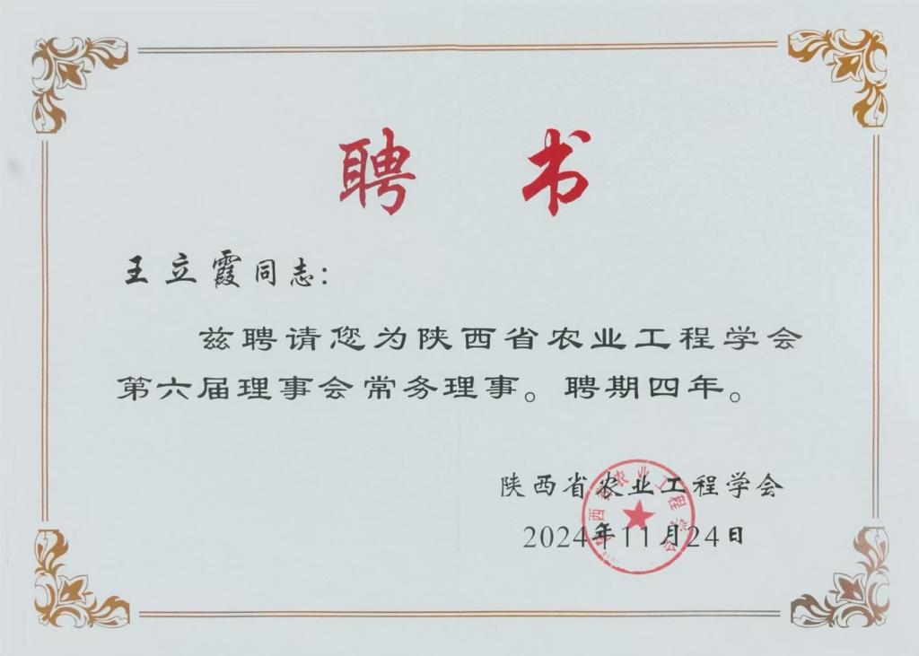 会议选举产生了陕西省农业工程学会第六届理事会,我院王立志教授,王立霞教授当选为常务理事,杨苗苗、王静、李白存3位教师当选为理事。